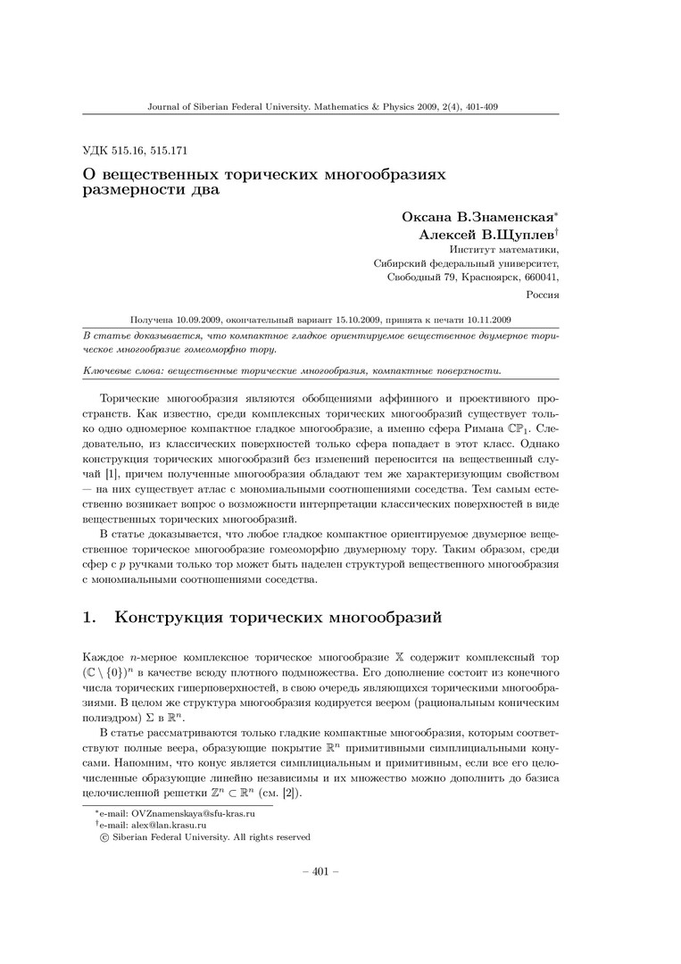 Библиографическое описание:Знаменская, О. В. О вещественных торических многообразиях размерности два = On Real Toric Varieties of Dimension Two / О. В. Знаменская, А. В. Щуплев. - Текст : непосредственный // Журнал Сибирского федерального университета. Математика и физика. - 2009. - Т. 2, № 4. - С. 401-409. - Библиогр.: с. 408-409. - ISSN 1997-1397.