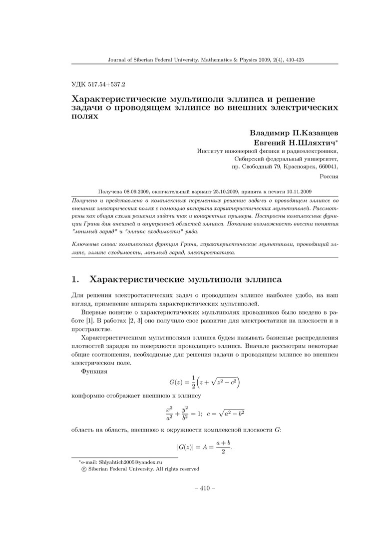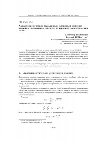 Аннотация:Получено и представлено в комплексных переменных решение задачи о проводящем эллипсе во внешних электрических полях с помощью аппарата характеристических мультиполей. Построены комплексные функции Грина для внешней и внутренней областей эллипса. Показана возможность ввести понятия "мнимый заряд" и "эллипс сходимости" ряда.