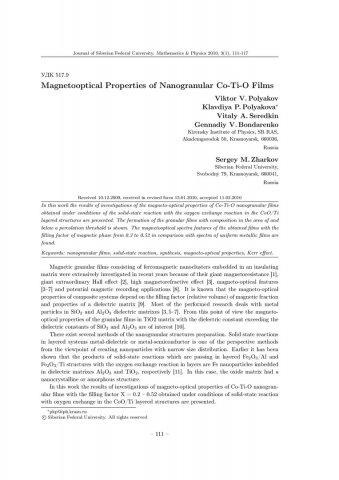 Библиографическое описание: Magnetooptical Properties of Nanogranular Co-Ti-O Films = Магнитооптические свойства наногранулированных пленок Co-Ti-O / V. V. Polyakov, K. P. Polyakova, V. A. Seredkin [et al.]. - Текст : непосредственный // Журнал Сибирского федерального университета. Математика и физика. - 2010. - Т. 3, № 1. - С. 111-117. - Библиогр.: с. 115-116 (14 назв.). - ISSN 1997-1397.