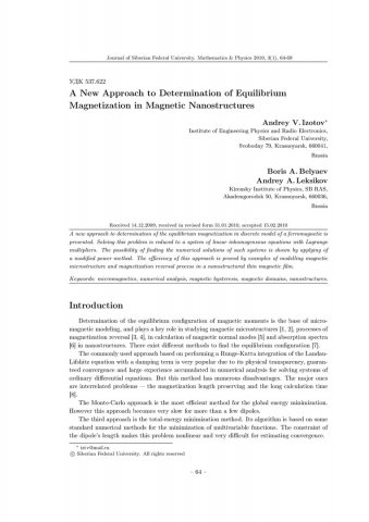 Библиографическое описание:Izotov, A. V. A New Approach to Determination of Equilibrium Magnetization in Magnetic Nanostructures = Новый подход к определению равновесного состояния намагниченности в магнитных наноструктурах / A. V. Izotov, B. A. Belyaev, A. A. Leksikov. - Текст : непосредственный // Журнал Сибирского федерального университета. Математика и физика. - 2010. - Т. 3, № 1. - С. 64-69. - Библиогр.: с. 68 (9 назв.). - ISSN 1997-1397.