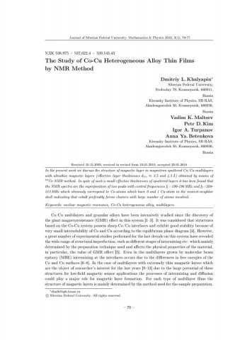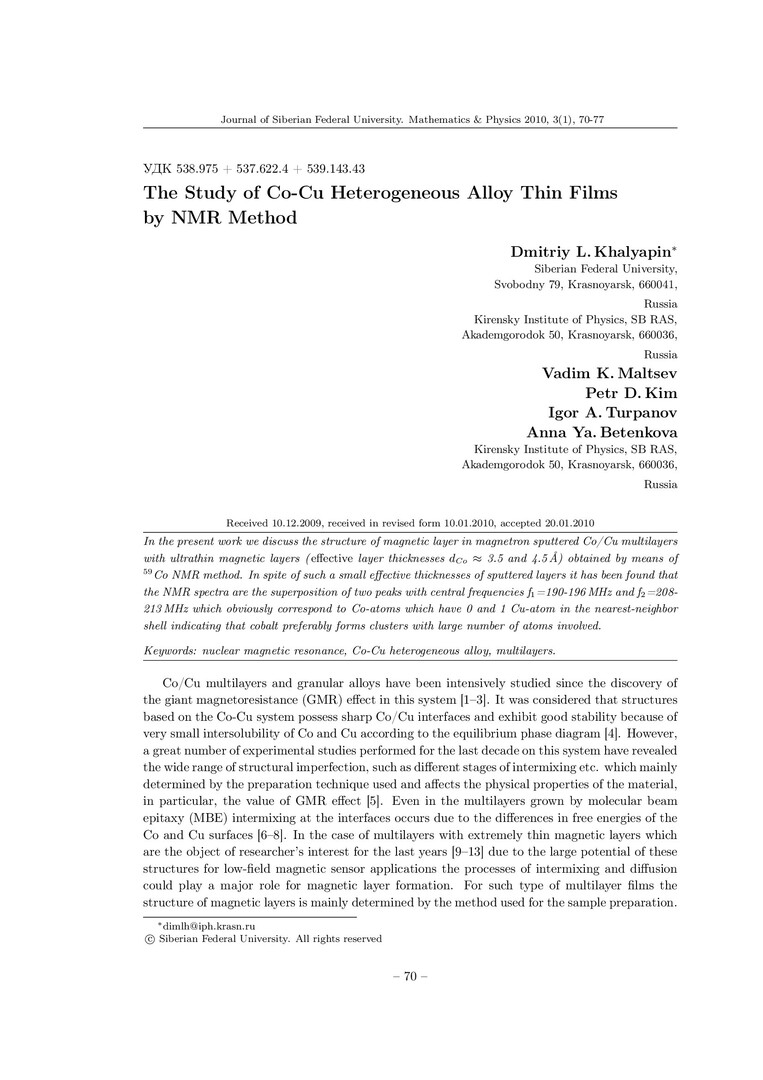Библиографическое описание: The Study of Co-Cu Heterogeneous Alloy Thin Films by NMR Method = Исследование тонких пленок неоднородных сплавов Co-Cu методами ЯМР / D. L. Khalyapin, V. K. Maltsev, P. D. Kim [et al.]. - Текст : непосредственный // Журнал Сибирского федерального университета. Математика и физика. - 2010. - Т. 3, № 1. - С. 70-77. - Библиогр.: с. 75-77 (18 назв.). - ISSN 1997-1397.