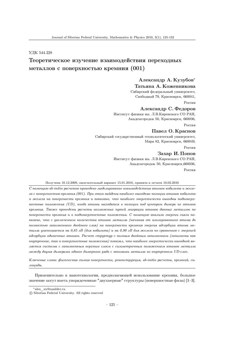 Библиографическое описание: Теоретическое изучение взаимодействия переходных металлов с поверхностью кремния (001) = Theoretical Investigation of Transition Metals Interaction with Silicon (001) Surface / А. А. Кузубов, Т. А. Кожевникова, А. С. Федоров [и др.]. - Текст : непосредственный // Журнал Сибирского федерального университета. Математика и физика. - 2010. - Т. 3, № 1. - С. 125-132. - Библиогр.: с. 131-132 (18 назв.). - ISSN 1997-1397.