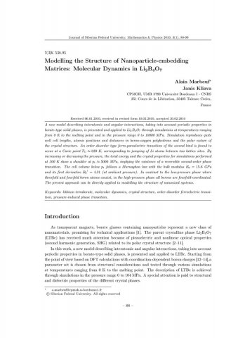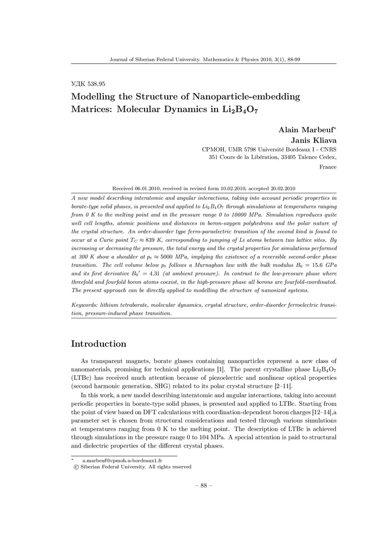 Библиографическое описание: Marbeuf, Alain. Modelling the Structure of Nanoparticle-embedding Matrices: Molecular Dynamics in Li[2]B[4]O[7] = Моделирование структуры матриц, включающих наночастицы: молекулярная динамика в Li[2]B[4]O[7] / Alain Marbeuf, Janis Kliava. - Текст : непосредственный // Журнал Сибирского федерального университета. Математика и физика. - 2010. - Т. 3, № 1. - С. 88-99. - Библиогр.: с. 97-98 (25 назв.). - ISSN 1997-1397.