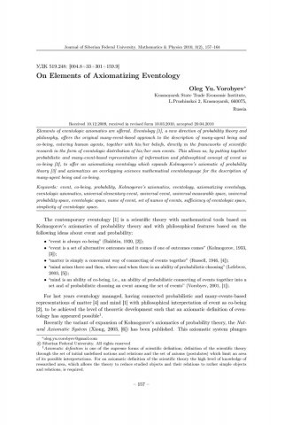 Библиографическое описание: Vorobyev, O. Yu. On Elements of Axiomatizing Eventology = О началах аксиоматизации эвентологии / O. Yu. Vorobyev. - Текст : непосредственный // Журнал Сибирского федерального университета. Математика и физика. - 2010. - Т. 3, № 2. - С. 157-164. - Библиогр.: с.164 (8 назв.) . - ISSN 1997-1397.