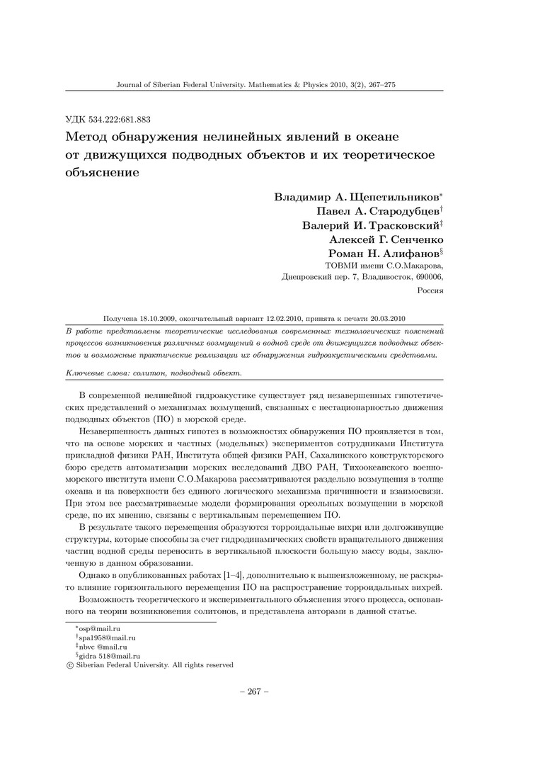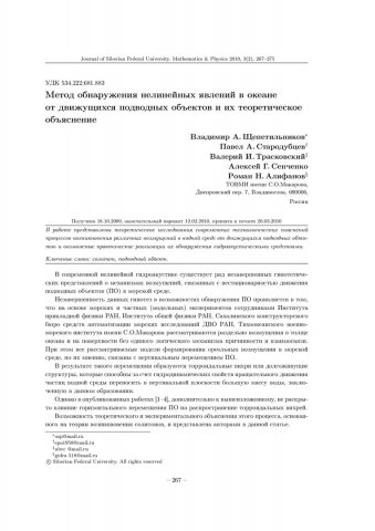 Библиографическое описание:Метод обнаружения нелинейных явлений в океане от движущихся подводных объектов и их теоретическое объяснение = Method of the Finding the Nonlinear Phenomenas in Ocean from Moving Undersea Object and their Theoretical Explanation / В. А. Щепетильников, П. А. Стародубцев, В. И. Трасковский [и др.]. - Текст : непосредственный // Журнал Сибирского федерального университета. Математика и физика. - 2010. - Т. 3, № 2. - С. 267-275. - Библиогр.: с. 274-275 (10 назв.). - ISSN 1997-1397.