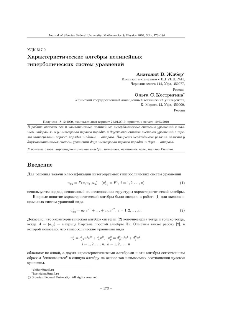 Библиографическое описание:Жибер, А. В. Характеристические алгебры нелинейных гиперболических систем уравнений = Characteristic Algebras of Nonlinear Hyperbolic Systems of Equations / А. В. Жибер, О. С. Костригина. - Текст : непосредственный // Журнал Сибирского федерального университета. Математика и физика. - 2010. - Т. 3, № 2. - С. 173-184. - Библиогр.: с. 184 (9 назв.). - ISSN 1997-1397.