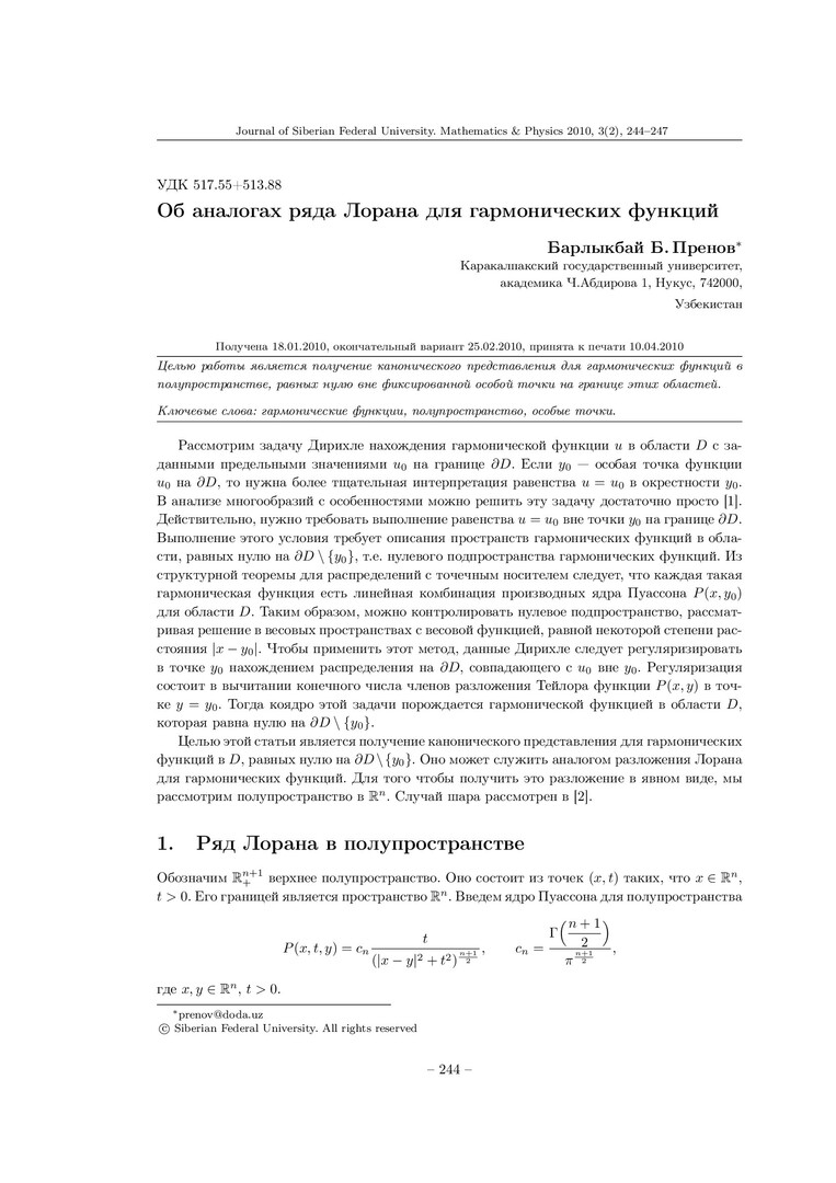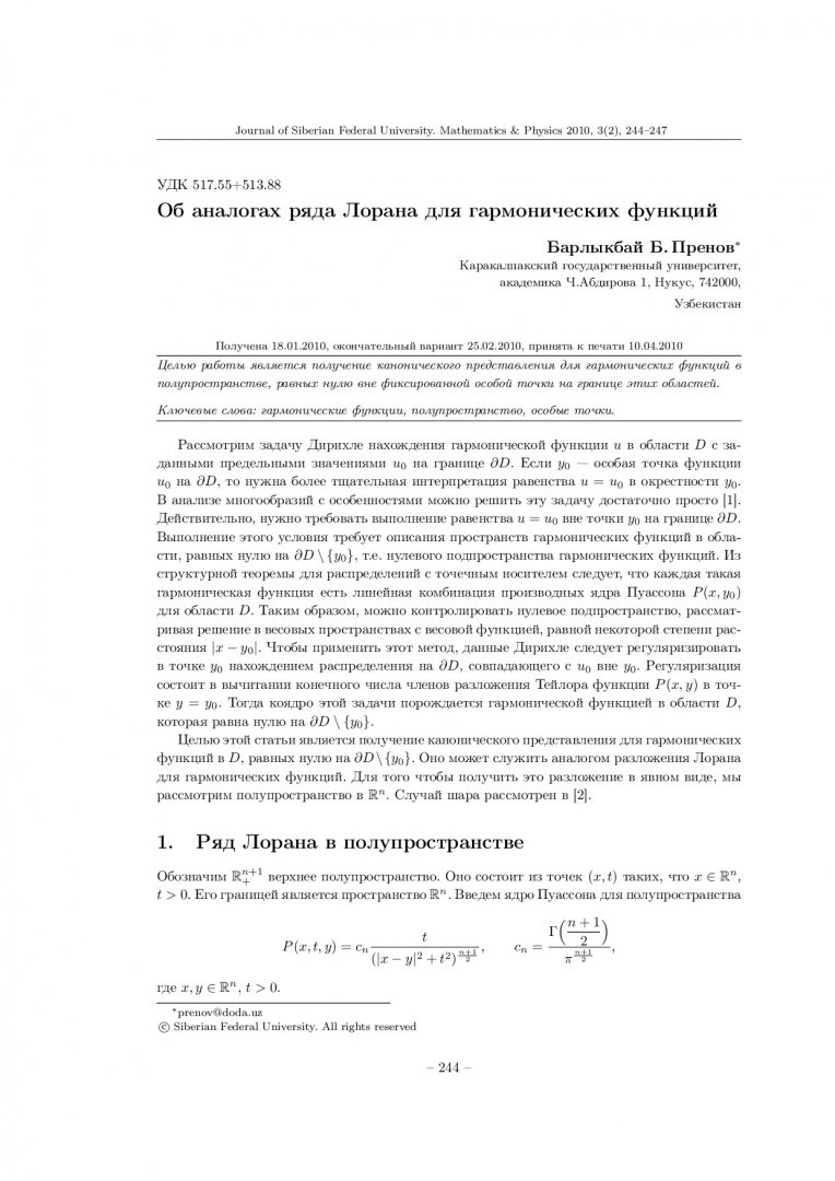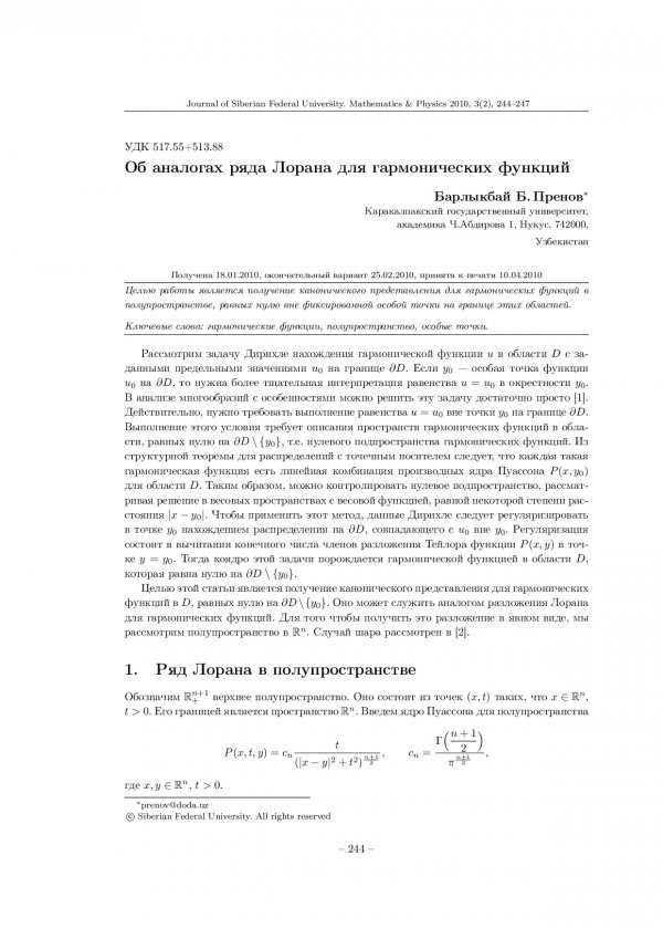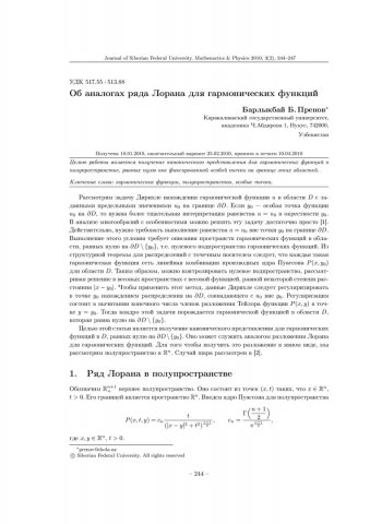 Библиографическое описание:Пренов, Б. Б. Об аналогах ряда Лорана для гармонических функций = On Analogues of Laurent Series for Harmonic Functions / Б. Б. Пренов. - Текст : непосредственный // Журнал Сибирского федерального университета. Математика и физика. - 2010. - Т. 3, № 2. - С. 244-247. - Библиогр.: с. 247 (5 назв.). - ISSN 1997-1397.