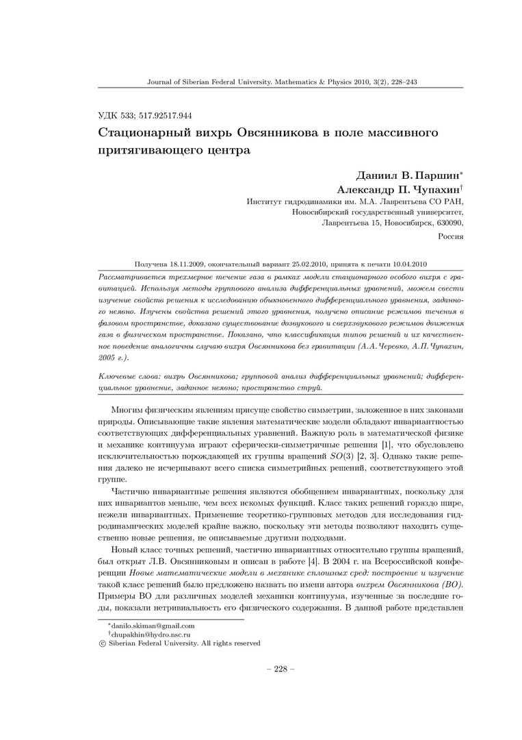 Библиографическое описание: Паршин, Д. В. Стационарный вихрь Овсянникова в поле массивного притягивающего центра = Stationary Ovsyannikov Vortex in the Field of Large Gravitating Center / Д. В. Паршин, А. П. Чупахин. - Текст : непосредственный // Журнал Сибирского федерального университета. Математика и физика. - 2010. - Т. 3, № 2. - С. 228-243. - Библиогр.: с. 243 (7 назв.). - ISSN 1997-1397.