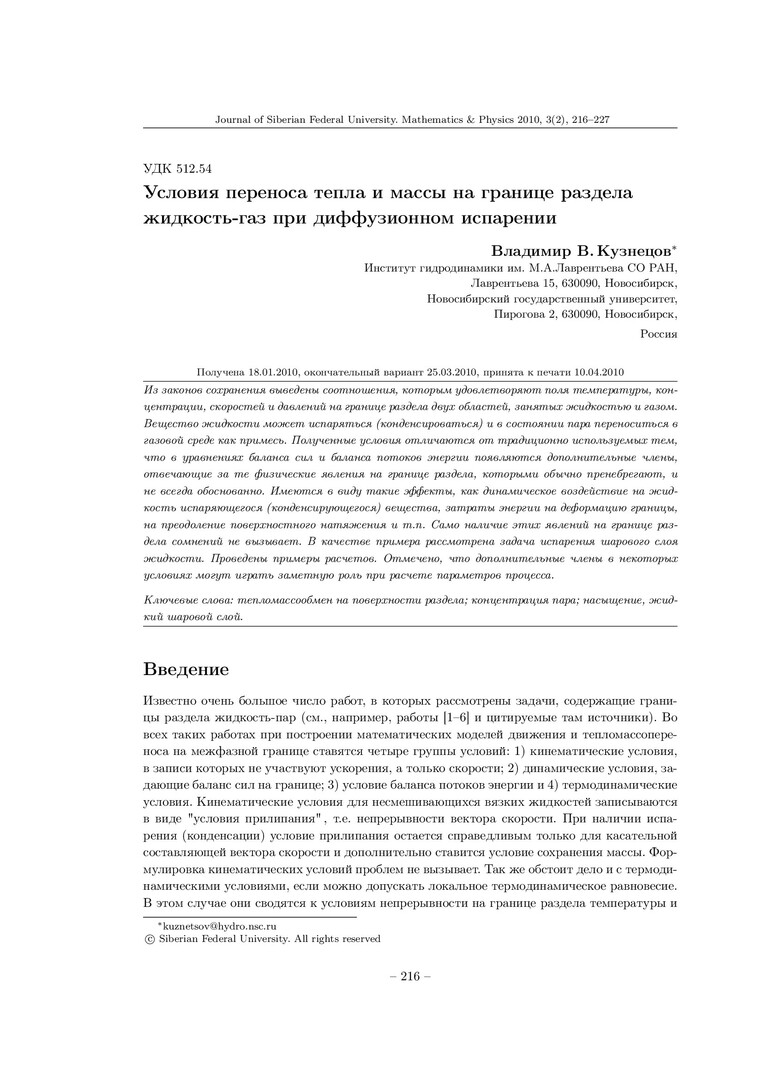 Библиографическое описание: Кузнецов, В. В. Условия переноса тепла и массы на границе раздела жидкость-газ при диффузионном испарении = Heat and Mass Transfer at the Liquid-gas Interface under Diffusion Evaporation / В. В. Кузнецов. - Текст : непосредственный // Журнал Сибирского федерального университета. Математика и физика. - 2010. - Т. 3, № 2. - С. 216-227. - Библиогр.: с. 227 (11 назв.). - ISSN 1997-1397.