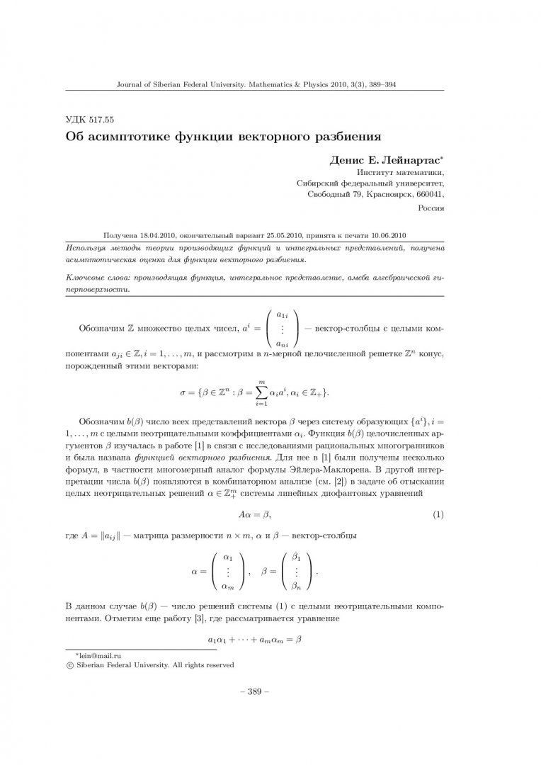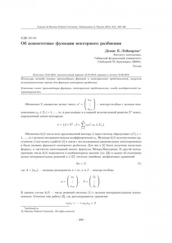 Библиографическое описание:Лейнартас, Д. Е. Об асимптотике функции векторного разбиения = On the Asymptotics of the Vector Partition Function / Д. Е. Лейнартас. - Текст : непосредственный // Журнал Сибирского федерального университета. Математика и физика. - 2010. - Т. 3, № 3. - С. 389-394. - Библиогр.: с. 394 (8 назв.). - ISSN 1997-1397.