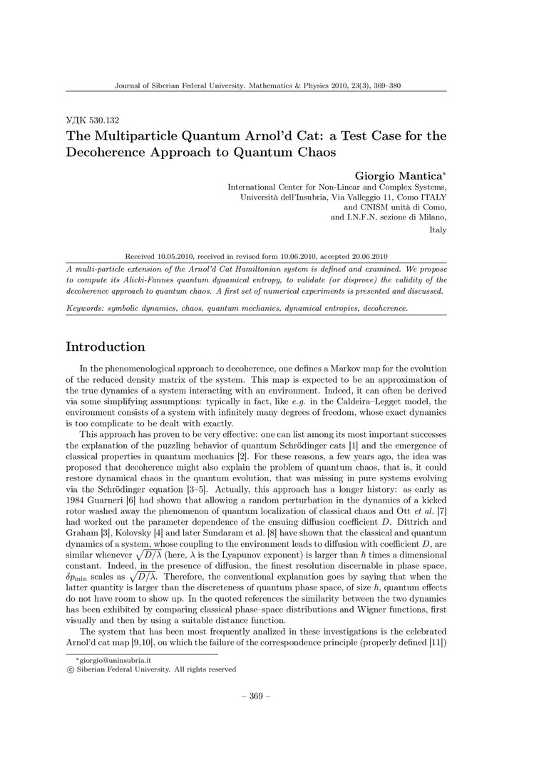 Библиографическое описание:Mantica, G. . The Multiparticle Quantum Arnol’d Cat: a Test Case for the Decoherence Approach to Quantum Chaos = Многочастичное квантовое отображение кота Арнольда: тестирование декогерентного подхода к проблеме квантового хаоса / G. Mantica. - Текст : непосредственный // Журнал Сибирского федерального университета. Математика и физика. - 2010. - Т. 3, № 3. - С. 369-380. - Библиогр.: с. 379-380 (40 назв.). - ISSN 1997-1397.