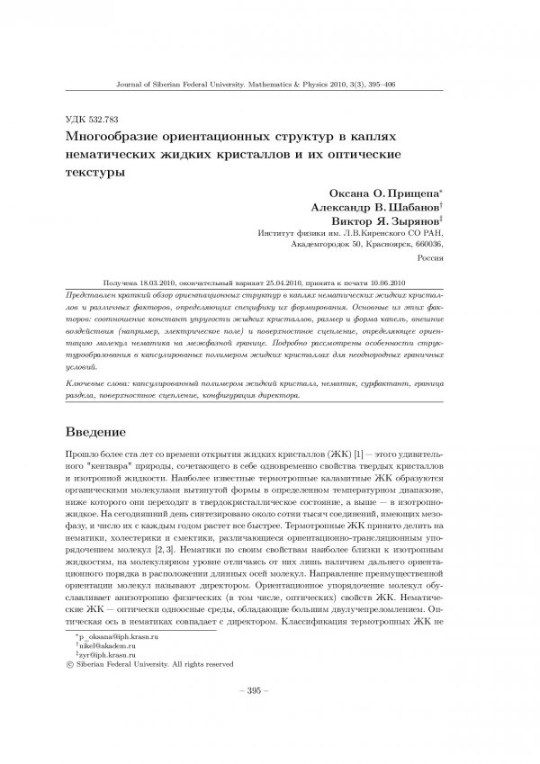 Библиографическое описание:Прищепа, О. О. Многообразие ориентационных структур в каплях нематических жидких кристаллов и их оптические текстуры = Variety of Orientational Structures in the Nematic Liquid Crystal Droplets and their Optical Textures / О. О. Прищепа, А. В. Шабанов, В. Я. Зырянов. - Текст : непосредственный // Журнал Сибирского федерального университета. Математика и физика. - 2010. - Т. 3, № 3. - С. 395-406. - Библиогр.: с. 405-406 (23 назв.). - ISSN 1997-1397.
