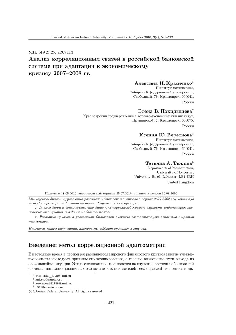 Аннотация:Мы изучаем динамику развития российской банковской системы в период 2007-2009 гг., используя метод корреляционной адаптометрии. Результаты следующие: 1. Анализ данных доказывает, что динамика корреляций может служить индикатором экономического кризиса и в данной области тоже. 2. Развитие кризиса в российской банковской системе соответствует основным мировым тенденциям.