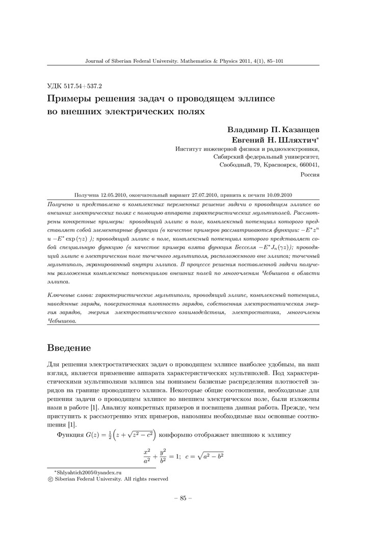 Библиографическое описание:Казанцев, Владимир. Примеры решения задач о проводящем эллипсе во внешних электрических полях = Examples of the Solution of the Electrostatic Problem about a Conductive Ellipse in Applied Electric Fields / В. П. Казанцев, Е. Н. Шляхтич. - Текст : непосредственный // Журнал Сибирского федерального университета. Математика и физика. - 2011. - Т. 4, № 1. - С. 85-101. - Библиогр.: с. 101. - ISSN 1997-1397.