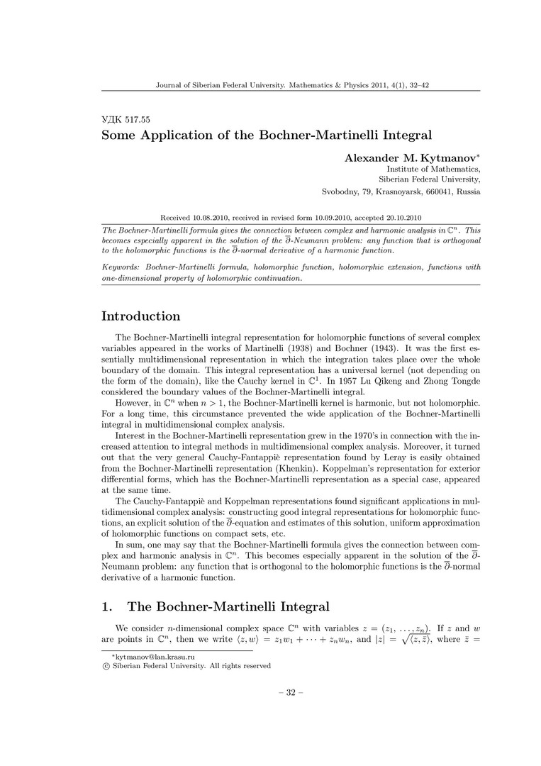 Библиографическое описание:Kytmanov, Alexander. Some Application of the Bochner-Martinelli Integral = Некоторые приложения интеграла Бохнера-Мартинелли / A. M. Kytmanov. - Текст : непосредственный // Журнал Сибирского федерального университета. Математика и физика. - 2011. - Т. 4, № 1. - С. 32-42. - Библиогр.: с. 41-42. - ISSN 1997-1397.