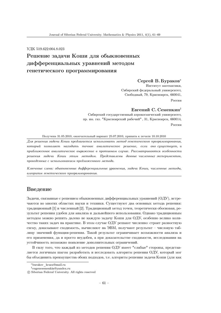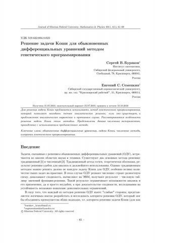 Библиографическое описание:Бураков, Сергей. Решение задачи Коши для обыкновенных дифференциальных уравнений методом генетического программирования = Ordinary Differential Equations Cauchy Problem Solving with Genetic Programming Techniques / С. В. Бураков, Е. С. Семенкин. - Текст : непосредственный // Журнал Сибирского федерального университета. Математика и физика. - 2011. - Т. 4, № 1. - С. 61-69. - Библиогр.: с. 69. - ISSN 1997-1397.