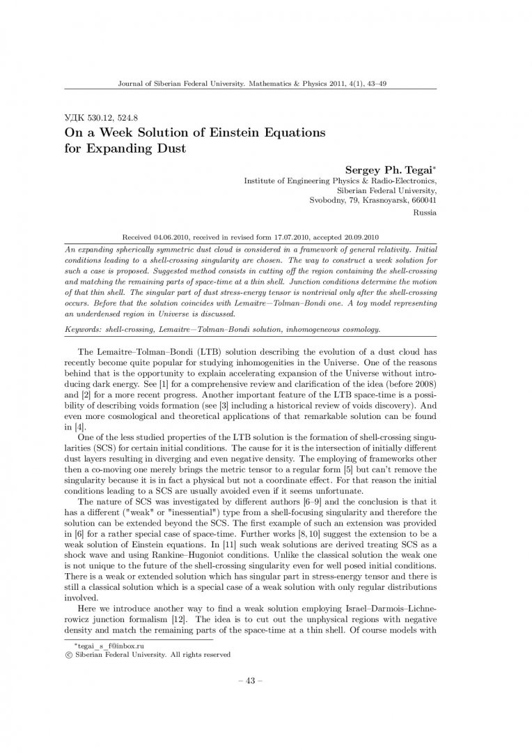 Библиографическое описание:Tegai, Sergey. On a Week Solution of Einstein Equations for Expanding Dust = О слабом решении уравнений Эйнштейна для расширяющейся пыли / S. Ph. Tegai. - Текст : непосредственный // Журнал Сибирского федерального университета. Математика и физика. - 2011. - Т. 4, № 1. - С. 43-49. - Библиогр.: с. 48-49. - ISSN 1997-1397.