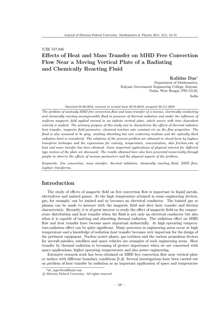 Библиографическое описание:Das, Kalidas. Effects of Heat and Mass Transfer on MHD Free Convection Flow Near a Moving Vertical Plate of a Radiating and Chemically Reacting Fluid = Влияние тепло- и массопереноса на свободно конвективное МГД-течение вблизи вертикального движущегося слоя излучающей и химически реагирующей жидкости / Kalidas Das. - Текст : непосредственный // Журнал Сибирского федерального университета. Математика и физика. - 2011. - Т. 4, № 1. - С. 18-31. - Библиогр.: с. 30-31. - ISSN 1997-1397.