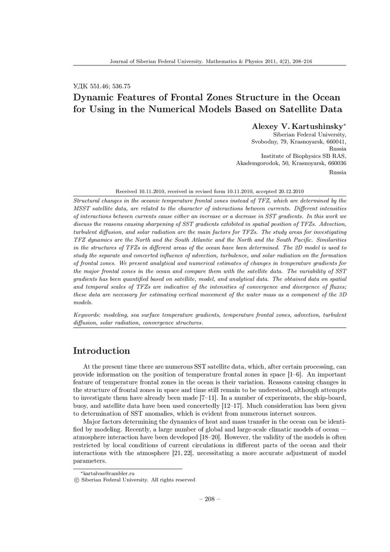 Библиографическое описание:Kartushinsky, Alexey. Динамические особенности структуры фронтальных зон в океане для использования в численных моделях, основанных на спутниковых данных = Dynamic Features of Frontal Zones Structure in the Ocean for Using in the Numerical Models Based on Satellite Data / A. V. Kartushinsky. - Текст : непосредственный // Журнал Сибирского федерального университета. Математика и физика. - 2011. - Т. 4, № 2. - С. 208-216. - Библиогр.: с. 214-216. - ISSN 1997-1397.