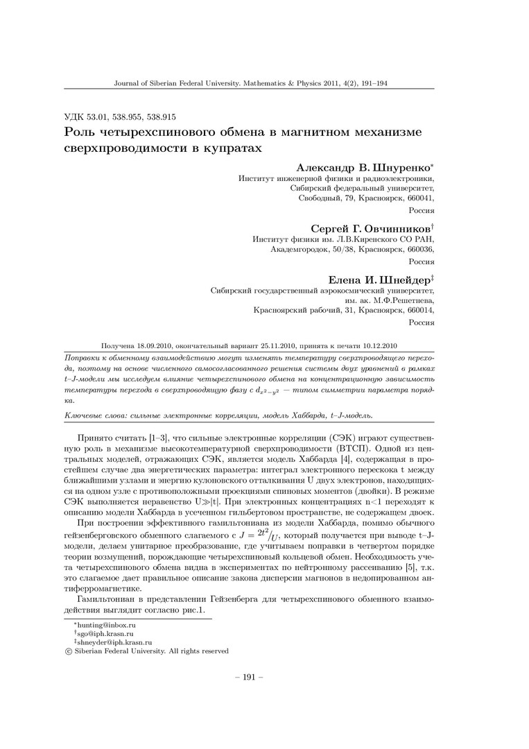 Библиографическое описание:Шнуренко, Александр. Роль четырехспинового обмена в магнитном механизме сверхпроводимости в купратах = Role of Four-spin Exchange in a Magnetic Mechanism of Superconductivity in Cuprates / А. В. Шнуренко, С. Г. Овчинников, Е. И. Шнейдер. - Текст : непосредственный // Журнал Сибирского федерального университета. Математика и физика. - 2011. - Т. 4, № 2. - С. 191-194. - Библиогр.: с. 194. - ISSN 1997-1397.