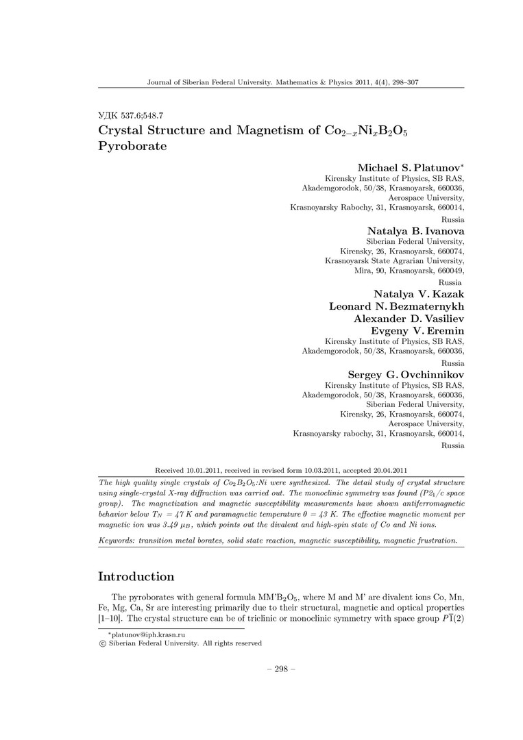 Библиографическое описание:Crystal Structure and Magnetism of Cosub2минусx/subNisubx/subBsub2/subOsub5/sub Pyroborate = Кристаллическая структура и магнетизм пиробората Co2минусxNixB2O5 / M. S. Platunov, N. B. Ivanova, N. V. Kazak [et al.]. - Текст : непосредственный // Журнал Сибирского федерального университета. Математика и физика. - 2011. - Т. 4, № 3. - С. 298-307. - Библиогр.: с. 306-307. - ISSN 1997-1397.
