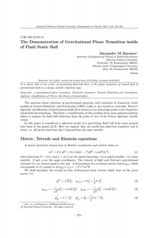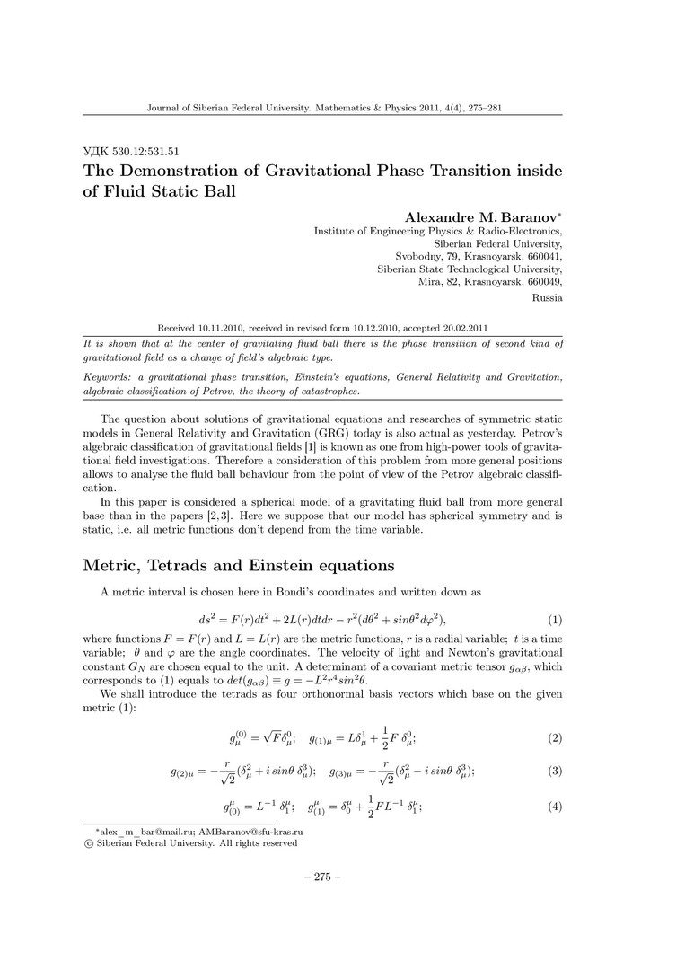 Библиографическое описание:Baranov, Alexandre. The Demonstration of Gravitational Phase Transition inside of Fluid Static Ball = Проявление гравитационного фазового перехода в жидком статическом шаре / A. M. Baranov. - Текст : непосредственный // Журнал Сибирского федерального университета. Математика и физика. - 2011. - Т. 4, № 3. - С. 275-281. - Библиогр.: с. 280-281. - ISSN 1997-1397.