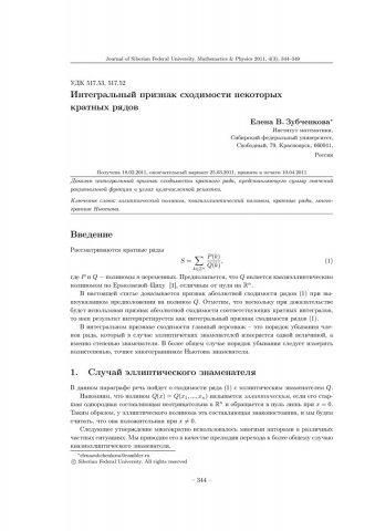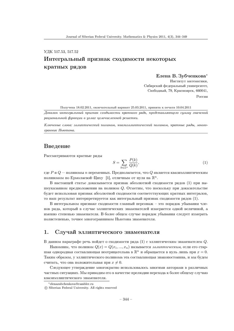 Библиографическое описание:Зубченкова, Елена. Интегральный признак сходимости некоторых кратных рядов = Integral Convergence Criterion for the Multiple Series / Е. В. Зубченкова. - Текст : непосредственный // Журнал Сибирского федерального университета. Математика и физика. - 2011. - Т. 4, № 3. - С. 344-349. - Библиогр.: с. 349. - ISSN 1997-1397.