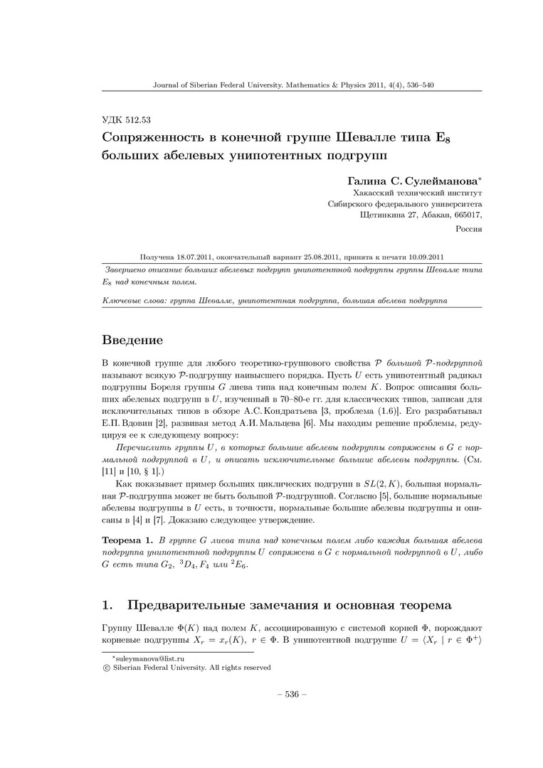 Библиографическое описание:Сулейманова, Галина. Сопряженность в конечной группе Шевалле типа E8 больших абелевых унипотентных подгрупп = Conjugacy of Large Abelian Unipotent Subgroups in a Finite Chevalley Group of Type E8 / Г. С. Сулейманова. - Текст : непосредственный // Журнал Сибирского федерального университета. Математика и физика. - 2011. - Т. 4, № 4. - С. 536-540. - Библиогр.: с. 540. - ISSN 1997-1397.