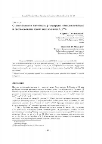 Библиографическое описание:Колесников, Сергей. О регулярности силовских p -подгрупп симплектических и ортогональных групп над кольцом Z/psupm/supZ = On the Regularity Sylows p-subgroups of Symplectic and Orthogonal Groups over Ring Z/pmZ / С. Г. Колесников, Н. В. Мальцев. - Текст : непосредственный // Журнал Сибирского федерального университета. Математика и физика. - 2011. - Т. 4, № 4. - С. 489-497. - Библиогр.: с. 497. - ISSN 1997-1397.