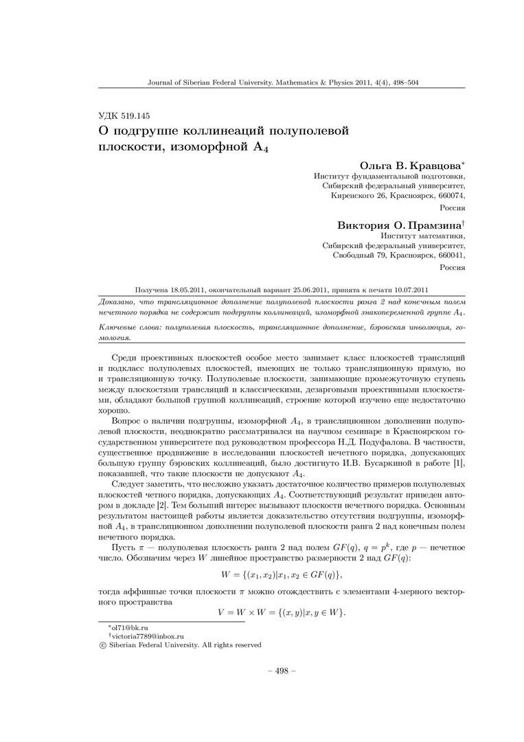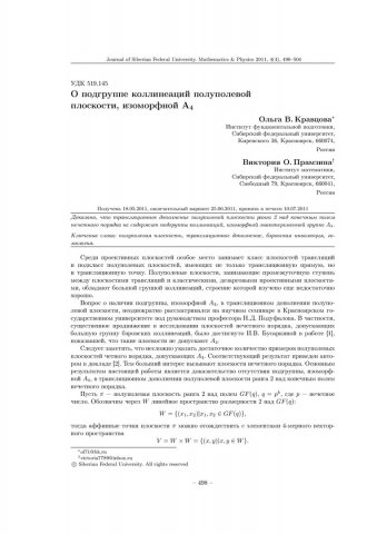 Библиографическое описание:Кравцова, Ольга. О подгруппе коллинеаций полуполевой плоскости, изоморфной A4 = On Collineation Subgroup of Semifield Plane That Isomorphic to A4 / О. В. Кравцова, В. О. Прамзина. - Текст : непосредственный // Журнал Сибирского федерального университета. Математика и физика. - 2011. - Т. 4, № 4. - С. 498-504. - Библиогр.: с. 504. - ISSN 1997-1397.