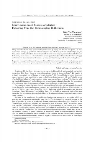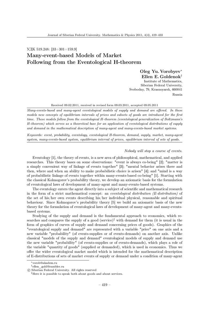 Библиографическое описание:Vorobyev, Oleg. Many-event-based Models of Market Following from the Eventological H-theorem = Многособытийные модели рынка, следующие из эвентологической H-теоремы / O. Yu. Vorobyev, E. E. Goldenok. - Текст : непосредственный // Журнал Сибирского федерального университета. Математика и физика. - 2011. - Т. 4, № 4. - С. 419-433. - Библиогр.: с. 432-433. - ISSN 1997-1397.