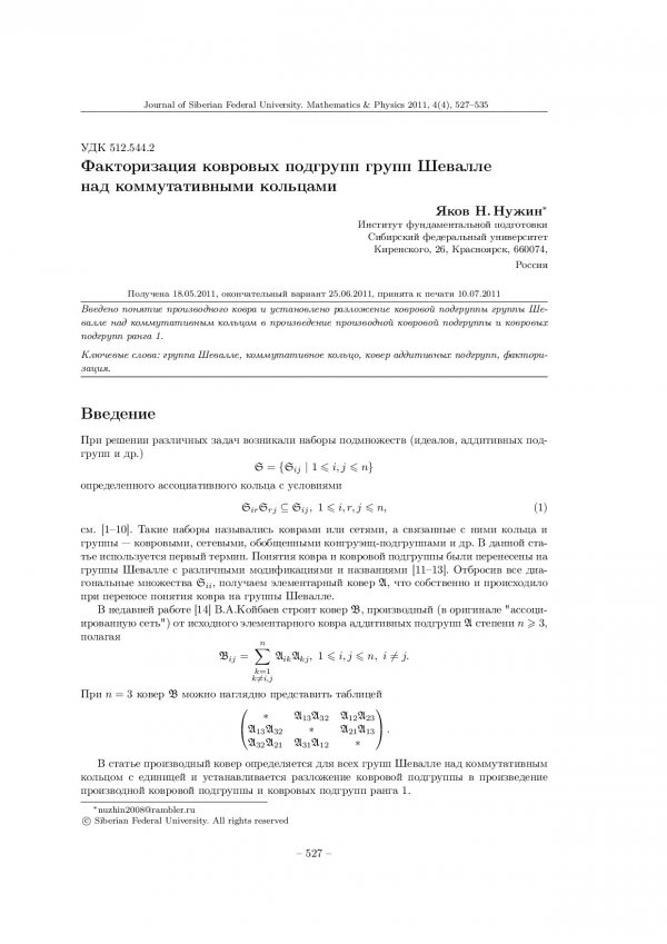 Библиографическое описание:Нужин, Яков. Факторизация ковровых подгрупп групп Шевалле над коммутативными кольцами = Factorization of Carpet Subgroups of the Chevalley Groups over Commutative Rings / Я. Н. Нужин. - Текст : непосредственный // Журнал Сибирского федерального университета. Математика и физика. - 2011. - Т. 4, № 4. - С. 527-535. - Библиогр.: с. 534-535. - ISSN 1997-1397.