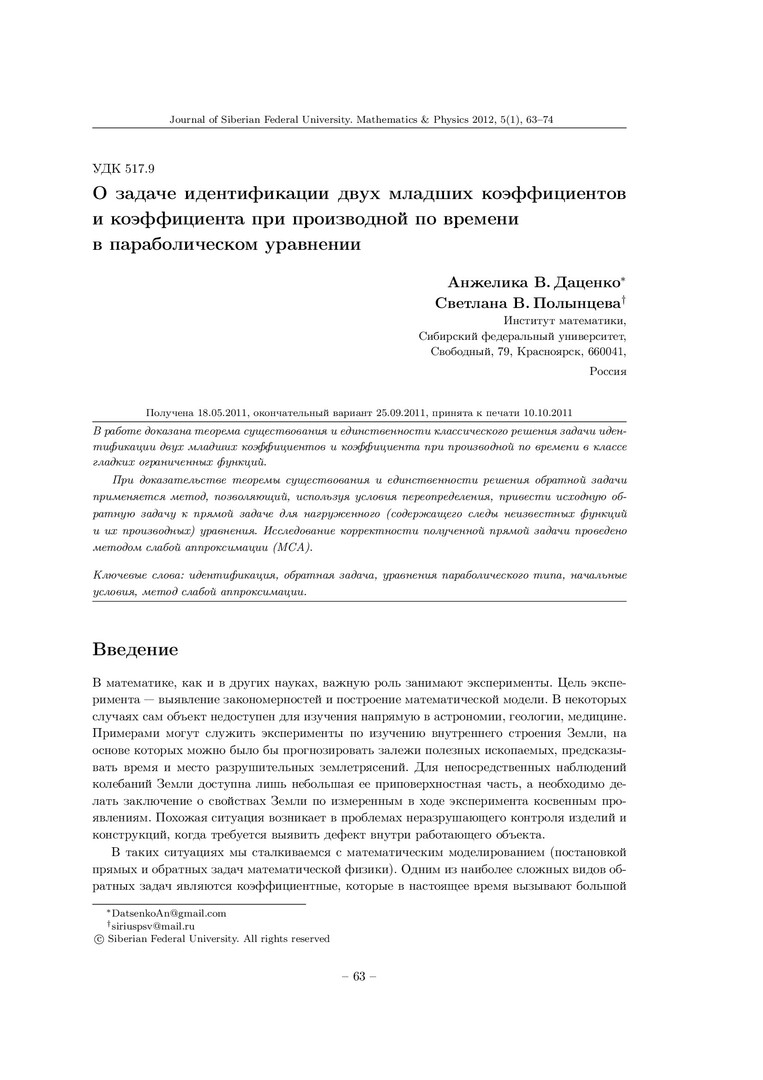 Библиографическое описание:Даценко, Анжелика. О задаче идентификации двух младших коэффициентов и коэффициента при производной по времени в параболическом уравнении = On the Problem of Identification of Two Lower Coefficients and the Coefficient by the Derivative with Respect to Time in the Parabolic Equation / А. В. Даценко, С. В. Полынцева. - Текст : непосредственный // Журнал Сибирского федерального университета. Математика и физика. - 2012. - Т. 5, № 1. - С. 63-74. - Библиогр.: с. 74. - ISSN 1997-1397.