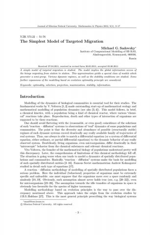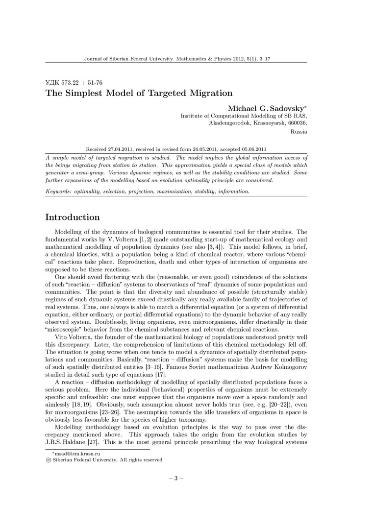 Библиографическое описание:Sadovsky, Michael. The Simplest Model of Targeted Migration = Простейшая модель целенаправленной миграции / M. G. Sadovsky. - Текст : непосредственный // Журнал Сибирского федерального университета. Математика и физика. - 2012. - Т. 5, № 1. - С. 3-17 : ил. - Библиогр.: с. 14-17 (58 назв.). - ISSN 1997-1397.