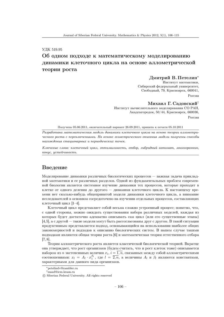 Библиографическое описание:Петелин, Дмитрий. Об одном подходе к математическому моделированию динамики клеточного цикла на основе аллометрической теории роста = Mathematical Model of Dynamics of a Cell Cycle Based on the Allometric Theory of Growth / Д. В. Петелин, М. Г. Садовский. - Текст : непосредственный // Журнал Сибирского федерального университета. Математика и физика. - 2012. - Т. 5, № 1. - С. 106-115. - Библиогр.: с. 115. - ISSN 1997-1397.