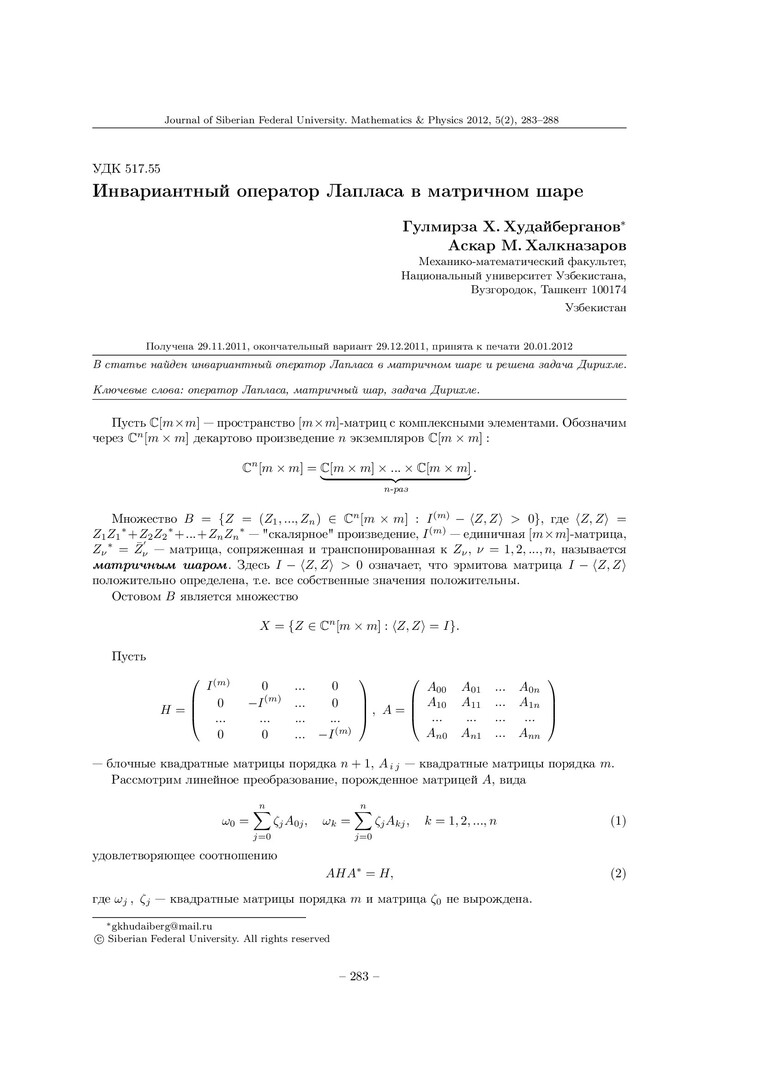 Библиографическое описание:Худайберганов, Гулмирза. Инвариантный оператор Лапласа в матричном шаре = Laplacian Invariant Operator in the Matrix Ball / Г. Х. Худайберганов, А. М. Халкназаров. - Текст : непосредственный // Журнал Сибирского федерального университета. Математика и физика. - 2012. - Т. 5, № 2. - С. 283-288. - Библиогр.: с. 288. - ISSN 1997-1397.