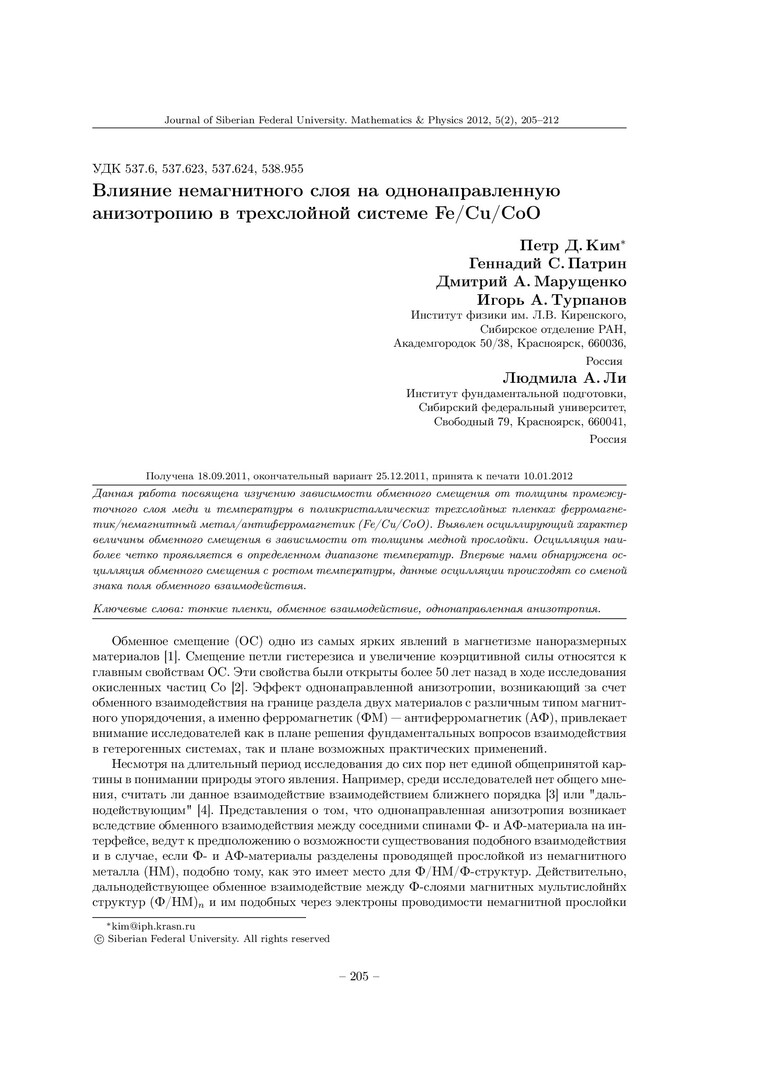 Аннотация:Данная работа посвящена изучению зависимости обменного смещения от толщины промежуточного слоя меди и температуры в поликристаллических трехслойных пленках ферромагнетик/немагнитный металл/антиферромагнетик.