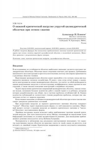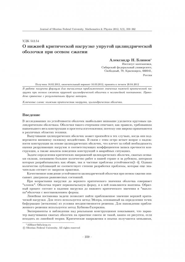 Библиографическое описание:Блинов, Александр. О нижней критической нагрузке упругой цилиндрической оболочки при осевом сжатии = On the Lower Critical Load of the Elastic Cylindrical Shell with Axial Compression / Александр Н. Блинов. - Текст : непосредственный // Журнал Сибирского федерального университета. Математика и физика. - 2012. - Т. 5, № 3. - С. 359-362. - Библиогр.: с. 362. - ISSN 1997-1397.
