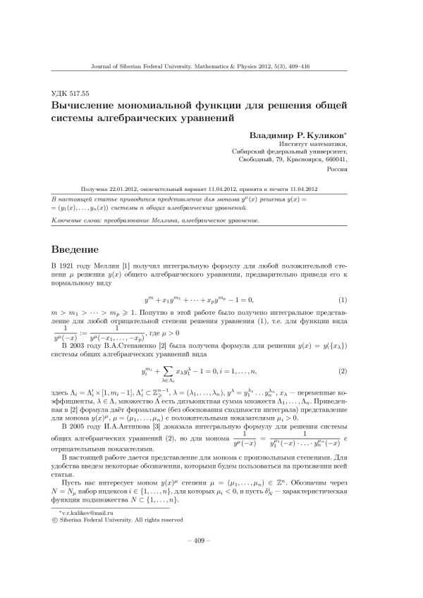 Библиографическое описание:Куликов, Владимир. Вычисление мономиальной функции для решения общей системы алгебраических уравнений = The Calculation of Monomial Functions for Solving the General System of Algebraic Eguations / В. Р. Куликов. - Текст : непосредственный // Журнал Сибирского федерального университета. Математика и физика. - 2012. - Т. 5, № 3. - С. 409-416. - Библиогр.: с. 416. - ISSN 1997-1397.