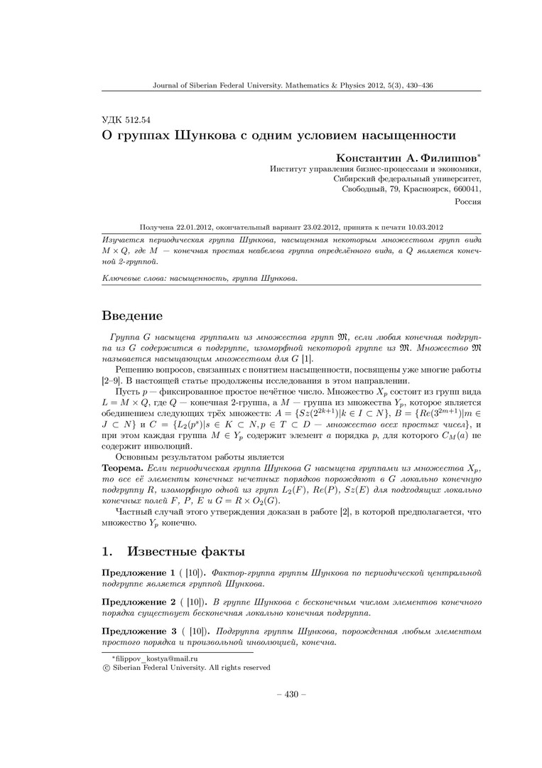 Библиографическое описание:Филиппов, Константин. О группах Щункова с одним условием насыщенности = On Shunkov Groups with One Saturated Condition / К. А. Филиппов. - Текст : непосредственный // Журнал Сибирского федерального университета. Математика и физика. - 2012. - Т. 5, № 3. - С. 430-436. - Библиогр.: с. 436. - ISSN 1997-1397.