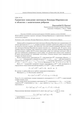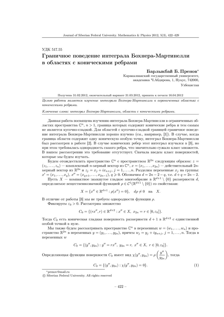 Библиографическое описание:Пренов, Барлыкбай. Граничное поведение интеграла Бохнера-Мартинелли в областях с коническими ребрами = The Boundary Behavior of the Bochner-Martinelli Integral in Domains with Conical Wedges / Б. Б. Пренов. - Текст : непосредственный // Журнал Сибирского федерального университета. Математика и физика. - 2012. - Т. 5, № 3. - С. 422-429. - Библиогр.: с. 429. - ISSN 1997-1397.