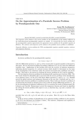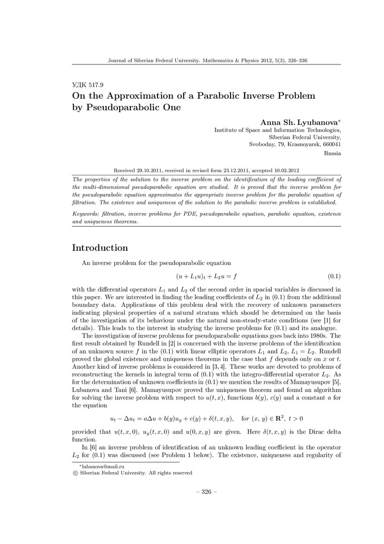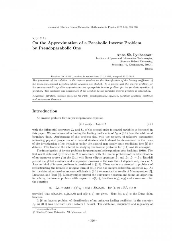 Библиографическое описание:Lyubanova, Anna. On the Approximation of a Parabolic Inverse Problem by Pseudoparabolic One = Об аппроксимации параболической обратной задачи псевдопараболической задачей / A. Sh. Lyubanova. - Текст : непосредственный // Журнал Сибирского федерального университета. Математика и физика. - 2012. - Т. 5, № 3. - С. 326-336. - Библиогр.: с. 335-336. - ISSN 1997-1397.