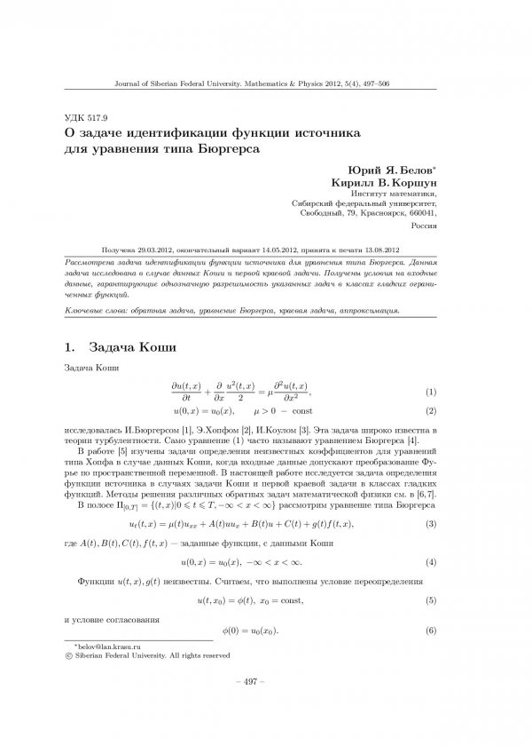 Библиографическое описание:Белов, Юрий. О задаче идентификации функции источника для уравнения типа Бюргерса = An Identification Problem of Source Function in the Burgers-type Equation / Ю. Я. Белов, К. В. Коршун. - Текст : непосредственный // Журнал Сибирского федерального университета. Математика и физика. - 2012. - Т. 5, № 4. - С. 497-506. - Библиогр.: с. 506. - ISSN 1997-1397.