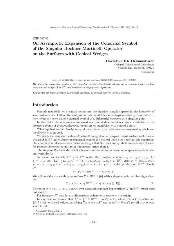 Библиографическое описание:Dzhumabaev, Davlatboi. On Asymptotic Expansion of the Conormal Symbol of the Singular Bochner-Martinelli Operator on the Surfaces with Conical Wedges = Об асимптотическом разложении конормального символа сингулярного интегрального оператора Бохнера-Мартинелли на поверхностях с коническими ребрами / D. Kh. Dzhumabaev. - Текст : непосредственный // Журнал Сибирского федерального университета. Математика и физика. - 2013. - Т. 6, № 1. - С. 18-27. - Библиогр.: с. 27. - ISSN 1997-1397.