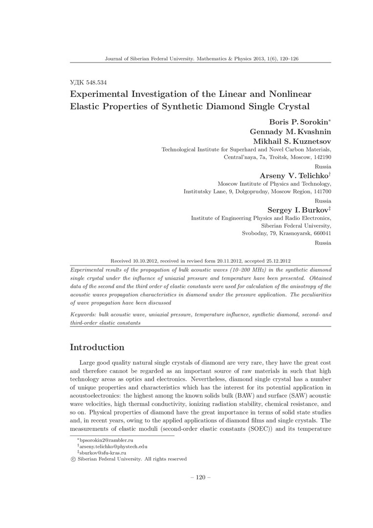Библиографическое описание:Experimental Inverstigation of the Linear and Nonlinear Elastic Properties of Synthetic Diamond Single Crystal = Экспериментальное исследование линейных и нелинейных упругих свойств синтетического монокристалла алмаза / B. P. Sorokin [et. al]. - Текст : непосредственный // Журнал Сибирского федерального университета. Математика и физика. - 2013. - Т. 6, № 1. - С. 120-126. - Библиогр.: с. 125-126. - ISSN 1997-1397.