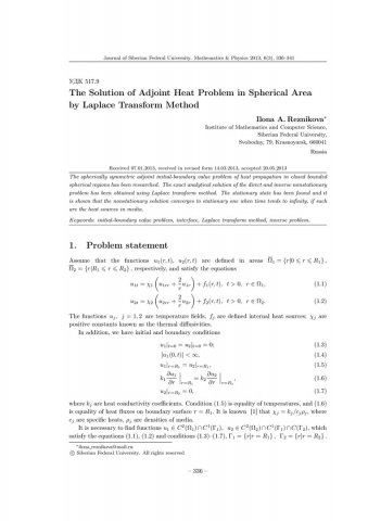 Библиографическое описание:Reznikova, Ilona. The Solution of Adjoint Heat Problem in Spherical Area by Laplace Transform Method = Решение сопряженной тепловой задачи в шаровой области методом преобразования Лапласа / Ilona A. Reznikova. - Текст : непосредственный // Журнал Сибирского федерального университета. Математика и физика. - 2013. - Т. 6, № 3. - С. 336-341. - Библиогр.: с. 341 (3 назв.). - ISSN 1997-1397.