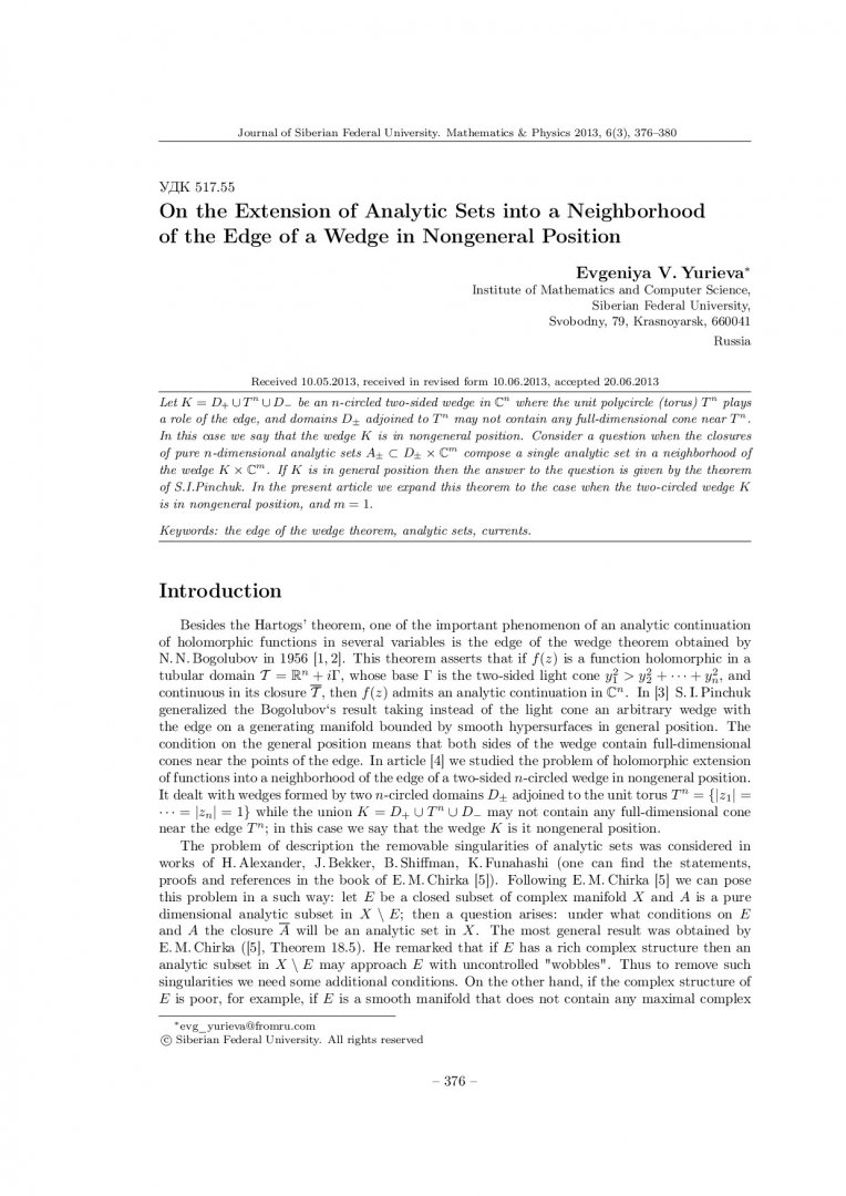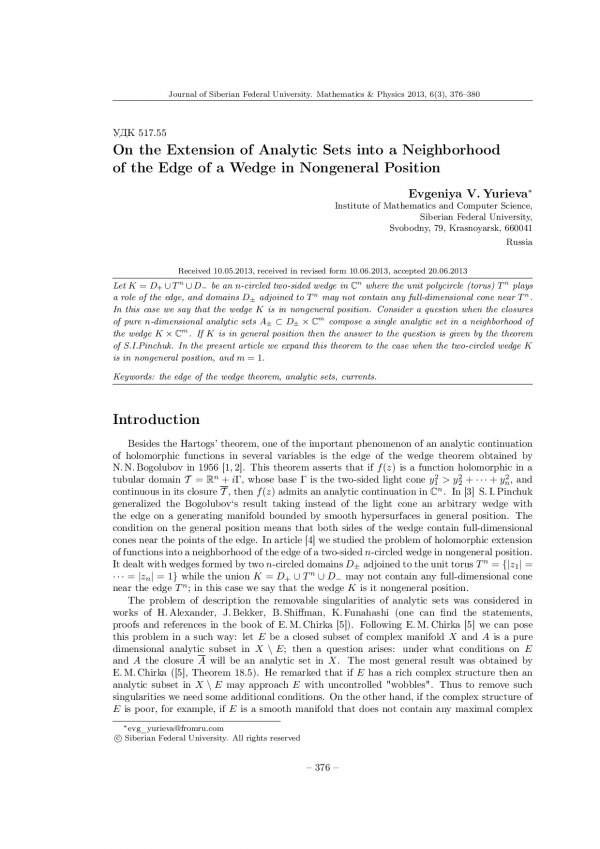 Библиографическое описание:Yurieva, Evgeniya. On the Extension of Analytic Sets into a Neighborhood of the Edge of a Wedge in Nongeneral Position = Продолжение аналитических множеств в окрестность острия клина необщего положения / Evgeniya V. Yurieva. - Текст : непосредственный // Журнал Сибирского федерального университета. Математика и физика. - 2013. - Т. 6, № 3. - С. 376-380 : ил. - Библиогр.: с. 380 (8 назв.). - ISSN 1997-1397.
