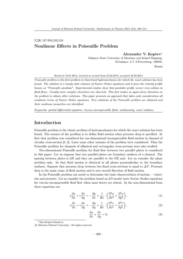 Библиографическое описание:Koptev, Alexander. Nonlinear Effects in Poiseuille Problem = Нелинейные эффекты в задаче Пуазейля / Alexander V. Koptev. - Текст : непосредственный // Журнал Сибирского федерального университета. Математика и физика. - 2013. - Т. 6, № 3. - С. 308-314 : табл. - Библиогр.: с. 314 (5 назв.). - ISSN 1997-1397.
