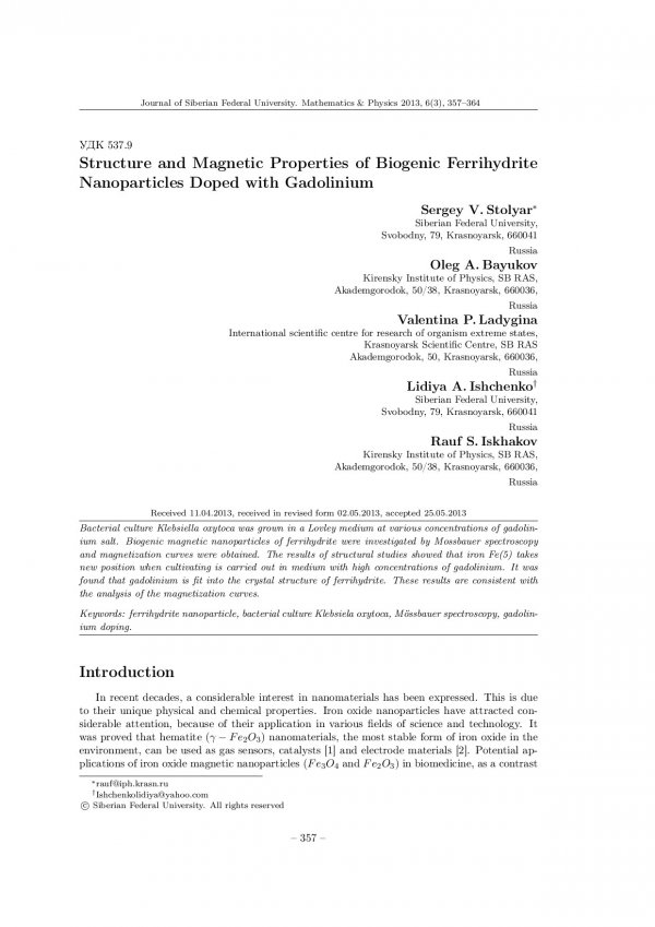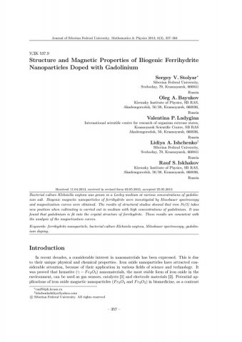 Библиографическое описание:Structure and Magnetic Properties of vBiogenic Ferrihydrite Nanoparticles Doped with Gadolinium = Структура и магнитные свойства биогенных наночастиц ферригидрита, легированных гадолинием / Sergey V. Stolyar [et al.]. - Текст : непосредственный // Журнал Сибирского федерального университета. Математика и физика. - 2013. - Т. 6, № 3. - С. 357-364 : ил. - Библиогр.: с. 363-364 (14 назв.). - ISSN 1997-1397.