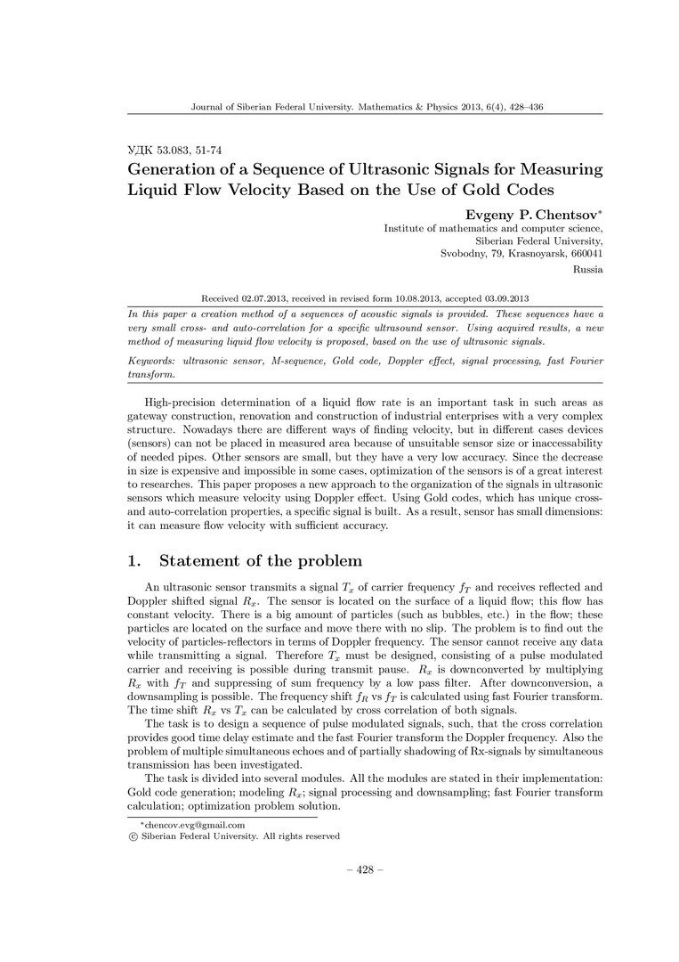 Библиографическое описание:Chentsov, Evgeny. Generation of a Sequence of Ultrasonic Signals for Measuring Liquid Flow Velocity Based on the Use of Gold Codes = Генерация последовательности ультразвуковых сигналов для измерения скорости потока жидкости с помощью кодов Голда / E. P. Chentsov. - Текст : непосредственный // Журнал Сибирского федерального университета. Математика и физика. - 2013. - Т. 6, № 4. - С. 428-436. - Библиогр.: с. 435-436. - ISSN 1997-1397.